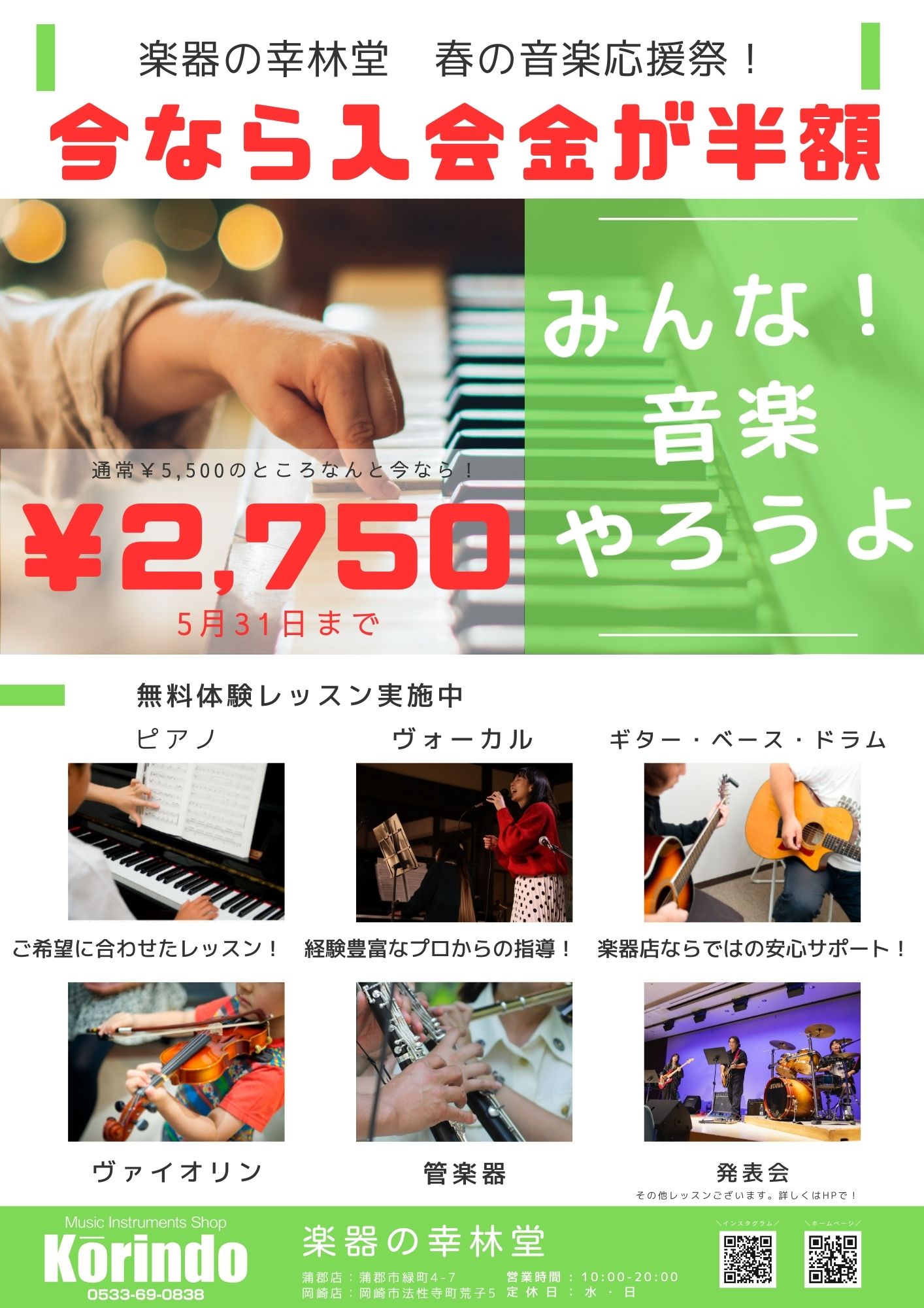 春の音楽応援祭!5/31まで入会金半額キャンペーン実施中