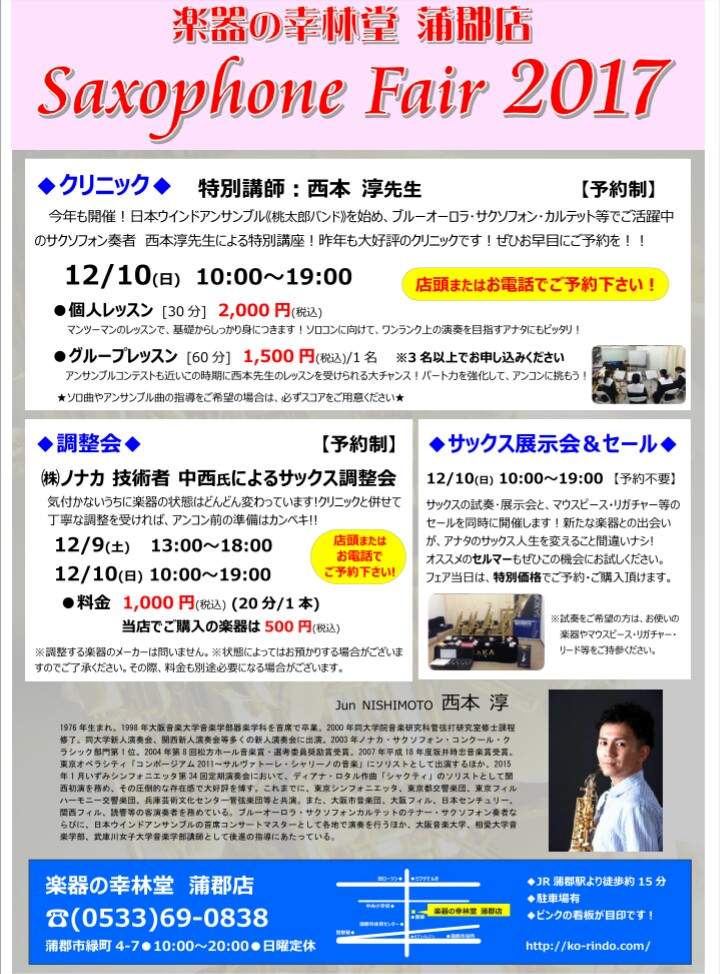 今年も開催!日本ウインドアンサンブル《桃太郎バンド》を始め、ブルーオーロラ・サクソフォン・カルテット等でご活躍中のサクソフォン奏者 西本淳先生による特別講座!昨年も大好評のクリニックです!ぜひお早目にご予約を!!